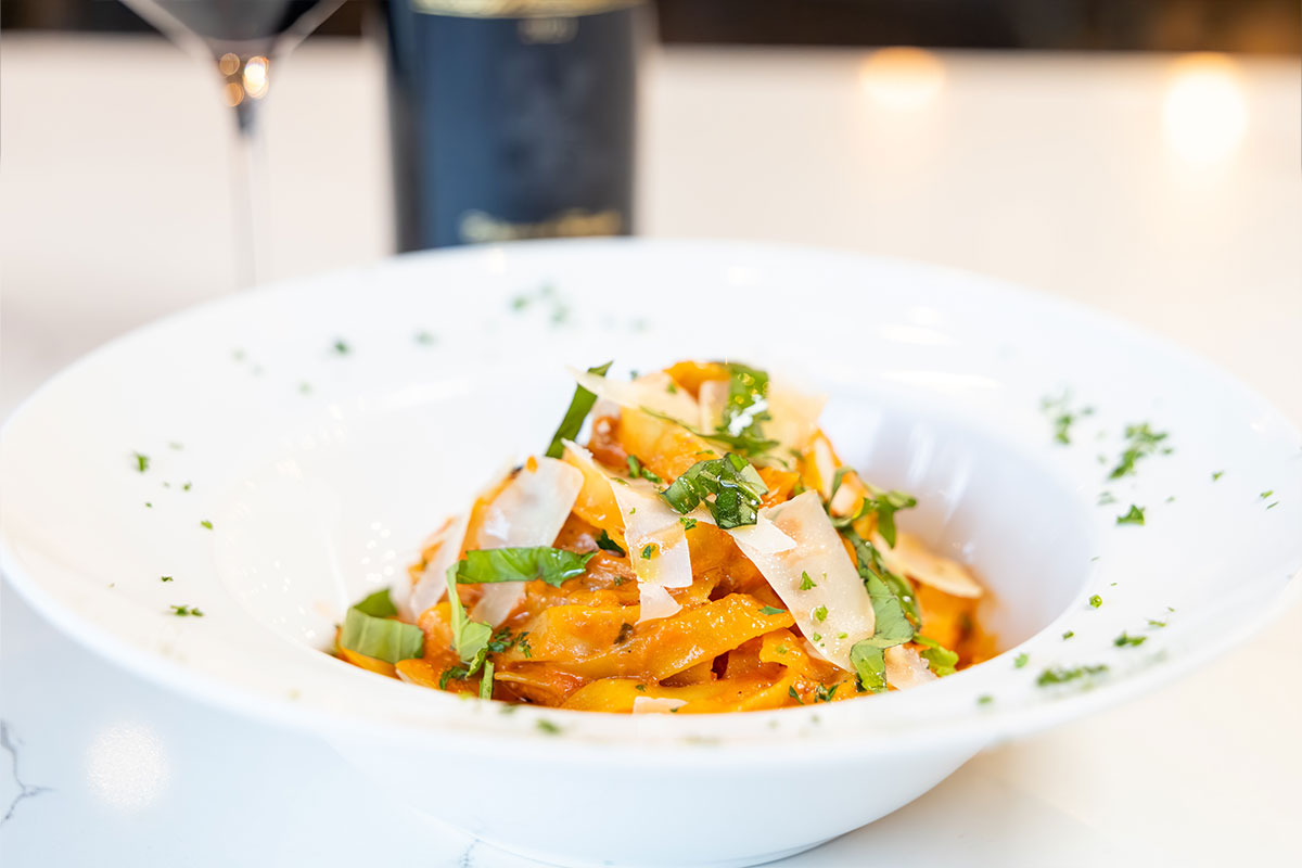 Each meal is prepared with care and the finest ingredients. Our menu features fresh salads, flavorful pastas, classic entrées like Chicken Marsala and Veal Parmigiana, and hand‑crafted pizzas baked to perfection. Whether you're here for a relaxed lunch, a dinner for two, or just a glass of wine after a long day, we want you to feel at ease.